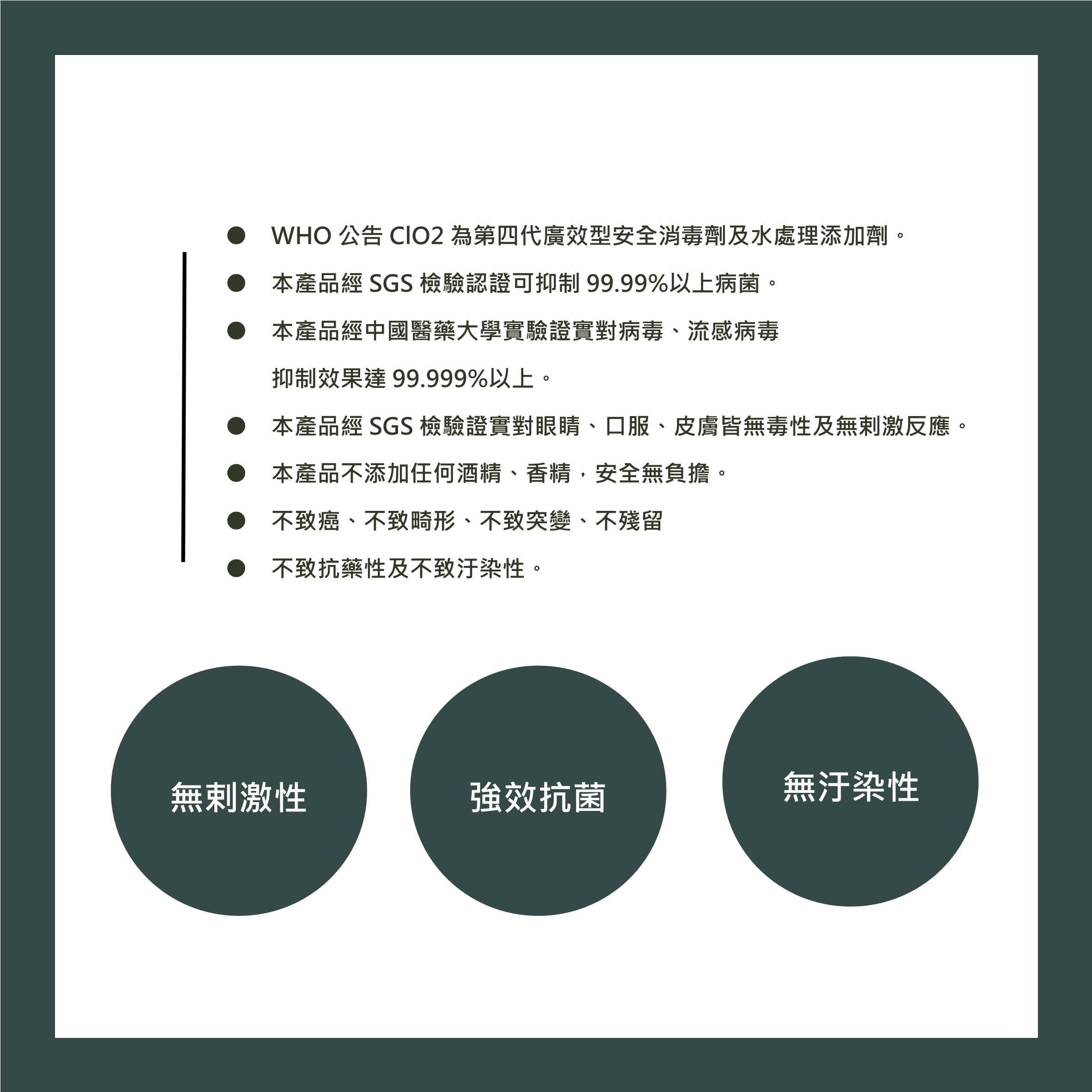 鑒於一般的消毒劑有如此多的使用限制,目前國際上已廣泛採用二氧化氯(ClO2),也就是對環境、人體及動物較為友善之綠色消毒劑。『二氧化氯』是屬於氧化系的殺菌劑,有強力氧化作用,無臭味、殘留,能破壞病毒細菌細胞膜上的酶,致使細菌被扼殺而死,與酒精、漂白水、次氯酸水等氯化系消毒劑相較,其殺菌效果略勝一籌。已被美國食品藥物管理局及美國環境保護署批准用於醫療衛生、食品加工、環境保護、自來水、及污水處理等之殺菌、消毒、除臭之用。